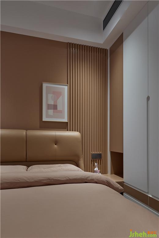 主臥利用床頭背景做了一個(gè)儲(chǔ)物柜加床頭柜,打破了一慣呆板的軟裝床頭柜對(duì)稱設(shè)計(jì),休息時(shí)閑坐在羊毛沙發(fā),裝修設(shè)計(jì)俯視江景想必把一天的疲憊都能消除殆盡。