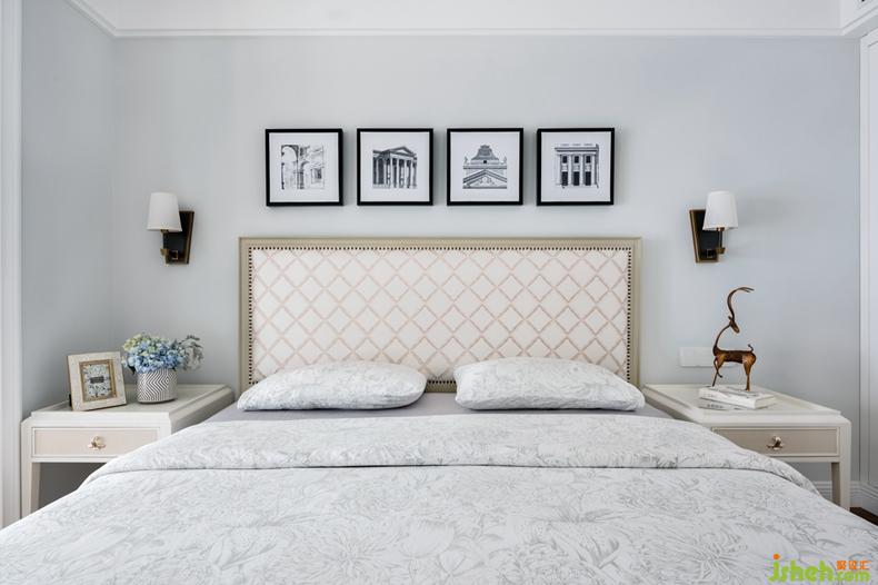 主臥整體舒緩雅致,淺灰色墻面與暖色家具進行搭配,自然的色彩層次過渡,讓室內(nèi)變得更加協(xié)調(diào),床頭四副精致的建筑裝飾畫經(jīng)典又活潑。室內(nèi)設(shè)計師