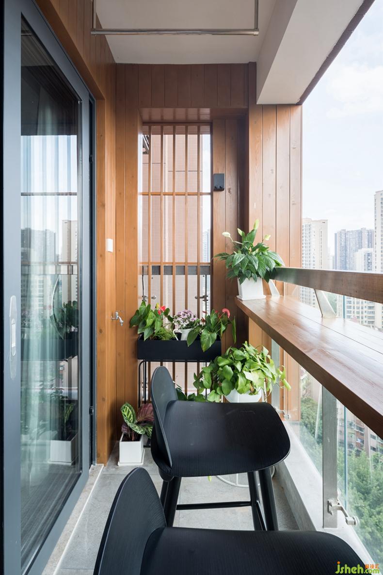 3.陽臺的設(shè)計很喜歡,用防腐木包裹,簡單的木板酒吧桌和高腳椅,以及綠植區(qū),吹吹風(fēng)喝杯酒,十分愜意。