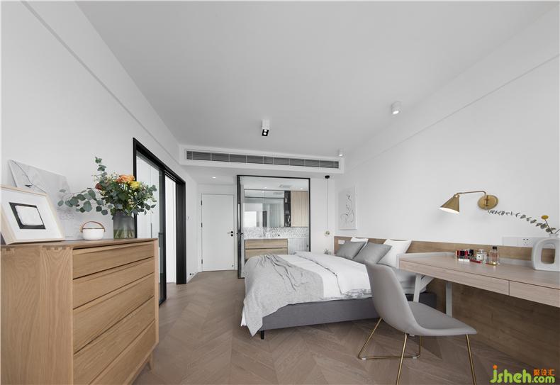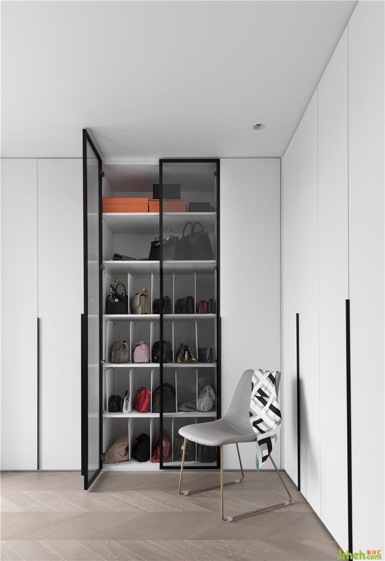 一門到頂?shù)囊鹿衽c極簡線條的柜門把手,自然的延伸了整個墻面,配合著展柜式的玻璃門柜體,可以盡情的放置女主人心愛的包包,在早上選擇搭配的時候也是一覽無遺的方便。不僅儲物功能增加可以放置多種衣物,還保持了衣帽間的整潔