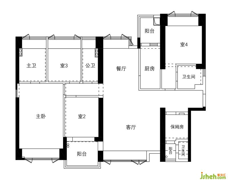 ④ 將通往臥室的過道兩旁的臥室及公衛(wèi)墻體做了內(nèi)移,取締了之前壓抑局促的過道;