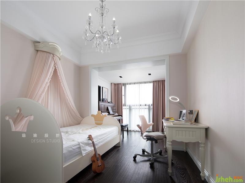 女兒房間的家具都是靠墻擺放,留出足夠的兒童活動(dòng)學(xué)習(xí)空間,打通了原來的陽臺(tái)區(qū)域,整面落地窗帶來足夠的自然光線;