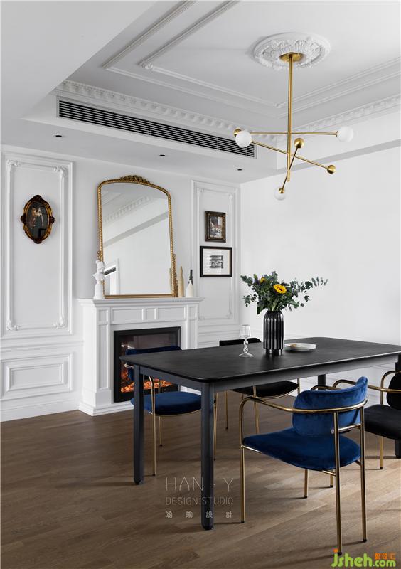 幾多純粹幾多溫馨,每一筆設(shè)計(jì)都在延伸著浪漫。隱約若現(xiàn)的精致壁爐與金色文藝的復(fù)古鏡,搭配黑色現(xiàn)代的實(shí)木餐桌與寶藍(lán)金屬輕奢椅,沉穩(wěn)中透著輕盈,高貴中帶有摩登。