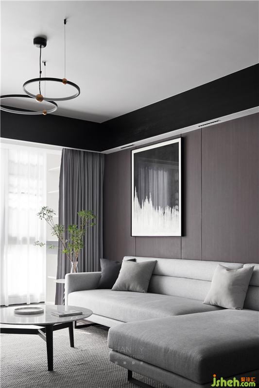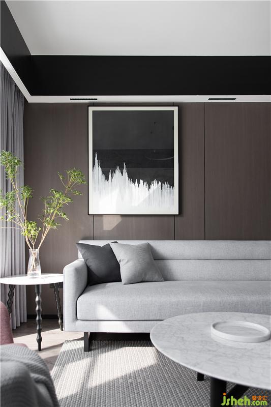 在背景木飾面我們選用淺棕結合黑色一個搭配法,并用淺灰色沙發(fā)點綴,整個空間顯得通透明亮,所有色彩都帶有灰度,展現(xiàn)一種對沉靜自持、舒緩簡單的向往,展現(xiàn)了純粹而定靜的本質。