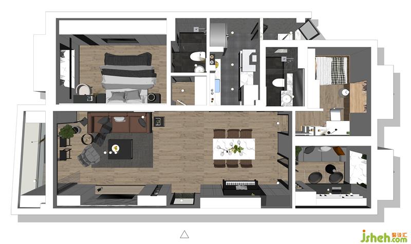 為了讓整體房間氛圍和家具干凈簡潔,不能太擁擠和厚重的感覺。我們將整體空間色調(diào)飽和度降低,經(jīng)過融合或隱藏的區(qū)域方式,淳樸的木元素為空間增加了自然氣息,來展現(xiàn)出簡潔干凈的空間。