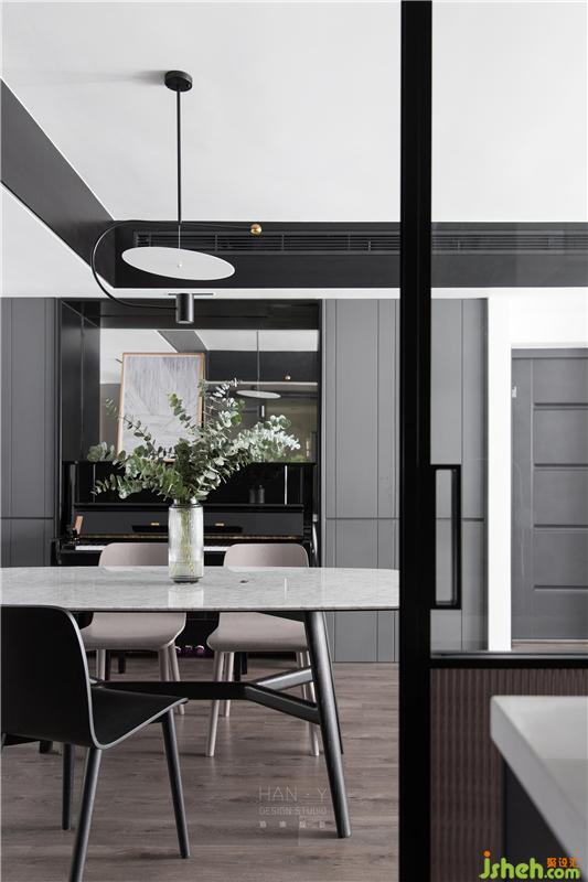 與餐廳的緊密連接處是另一番小天地,將鋼琴設計在儲物柜之間,加上鏡子給予的擴容既視感,兩者之間的搭配融洽,給空間增添了穩(wěn)重,優(yōu)雅。黑白灰色調(diào)的空間中有種能夠讓人迅速,平靜下來的魔力,簡而不減的搭配來制造屋子里的另一種安靜的美。