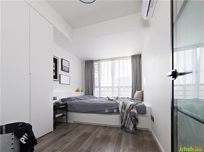 收納對于這對小情侶來說也是足夠的,除了衣柜,床的部分看起來不僅有安全感,床柜下還有一整面的儲物空間來收納生活衣物用品等等,實用性與美觀性并存。