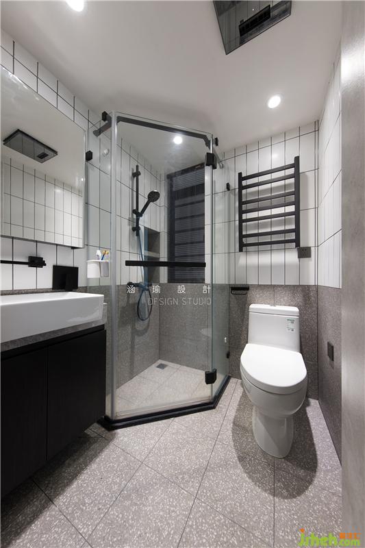 最后就是衛(wèi)生間的空間啦,它就隱藏在電視背景墻背后的空間里,同樣也是黑白經(jīng)典色搭配,小空間是不需要過多的裝飾,簡單細(xì)致的線條更能讓人放松。