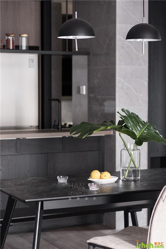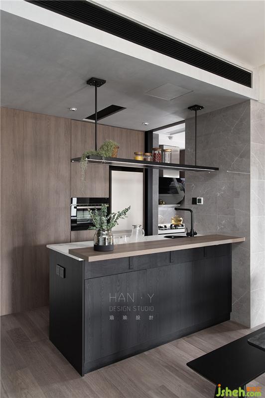 由于兩人都有喝咖啡的習(xí)慣,休閑時(shí)刻,男主會(huì)在島臺(tái)用咖啡機(jī)沖咖啡,女主則動(dòng)手做舒芙蕾松餅來(lái)進(jìn)行搭配。島臺(tái)上方設(shè)計(jì)的吊架,增添島臺(tái)的收納,也同時(shí)是操作時(shí)的照明燈。