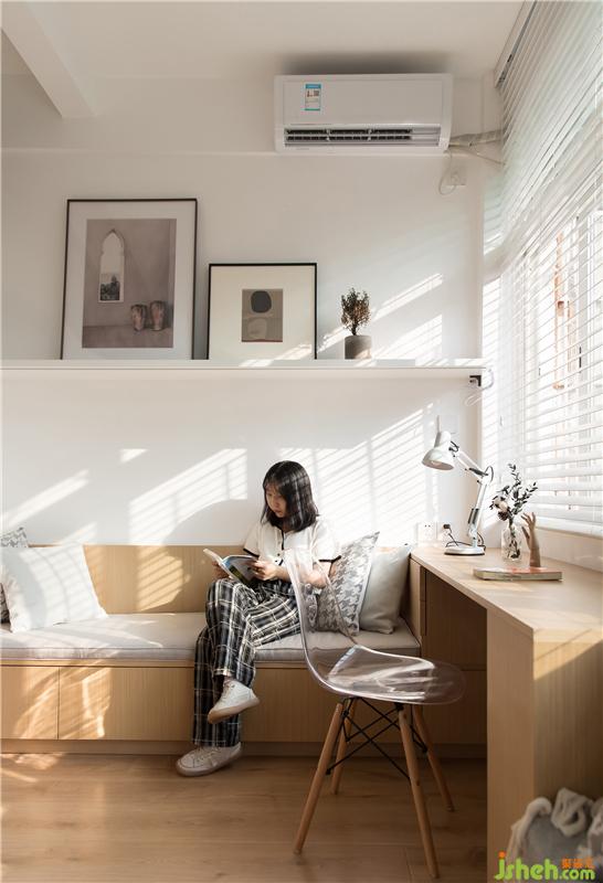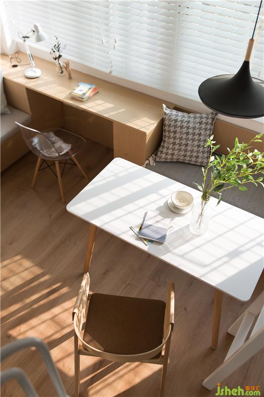 從走廊過來就是客廳與餐廳相連的空間,包括君君的學(xué)習(xí)區(qū)也在這個位置。經(jīng)過百葉簾的過濾,陽光也成了家里自然唯美的裝飾。