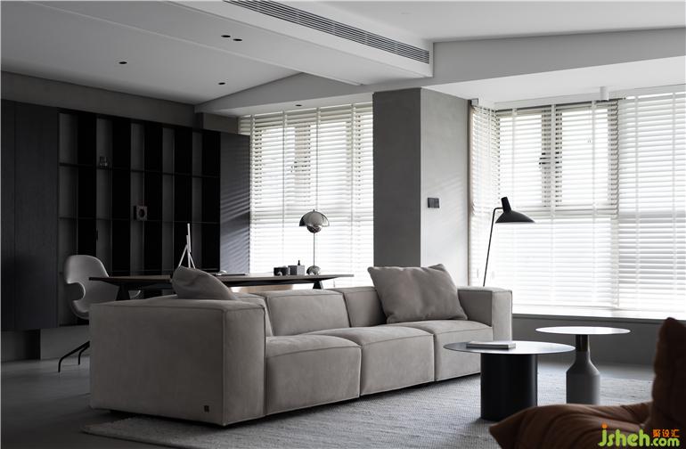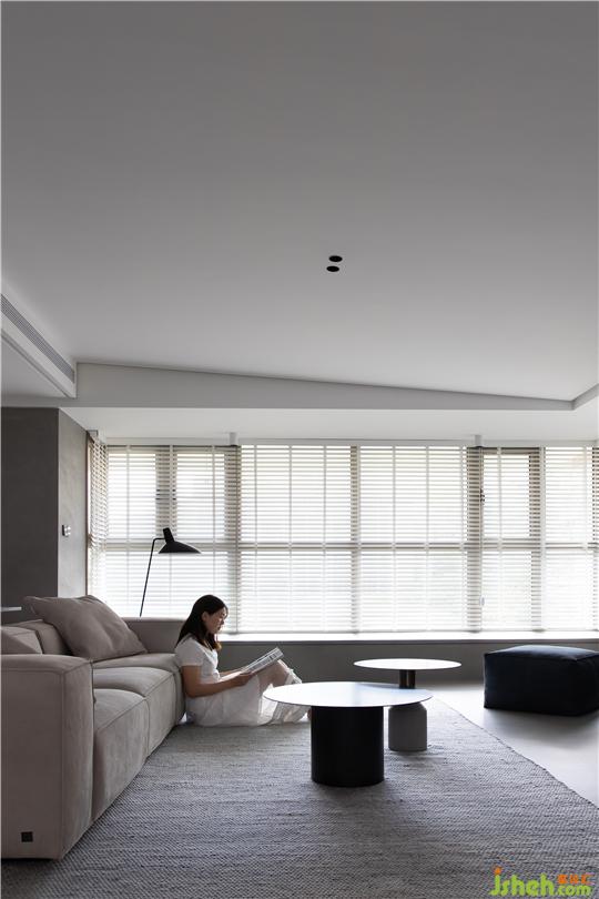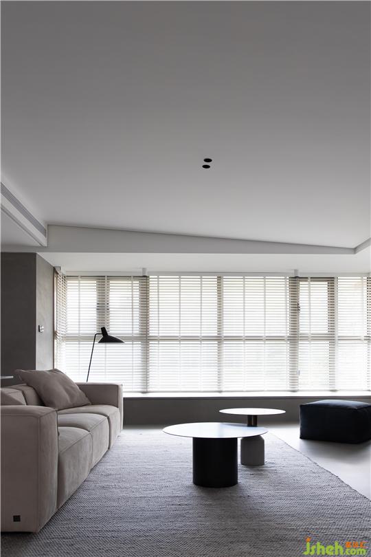 ① 將客廳與玄關(guān)區(qū)隔墻打通,打開后的客餐廳區(qū)域擁有良好的互動關(guān)系,暖灰色微水泥地面讓空間視覺表達(dá)統(tǒng)一有序。