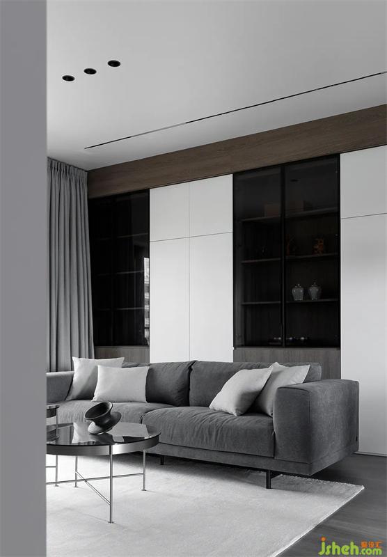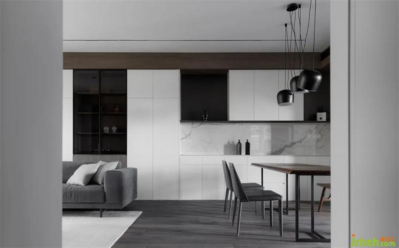 白色與木色的定制家具、大理石墻磚、黑色的鋼板、玻璃,以及素雅的胡桃木色,呈現(xiàn)出大氣脫俗的質(zhì)感。表面上看不到多余的物品,實則巧妙的藏在設(shè)計當(dāng)中。