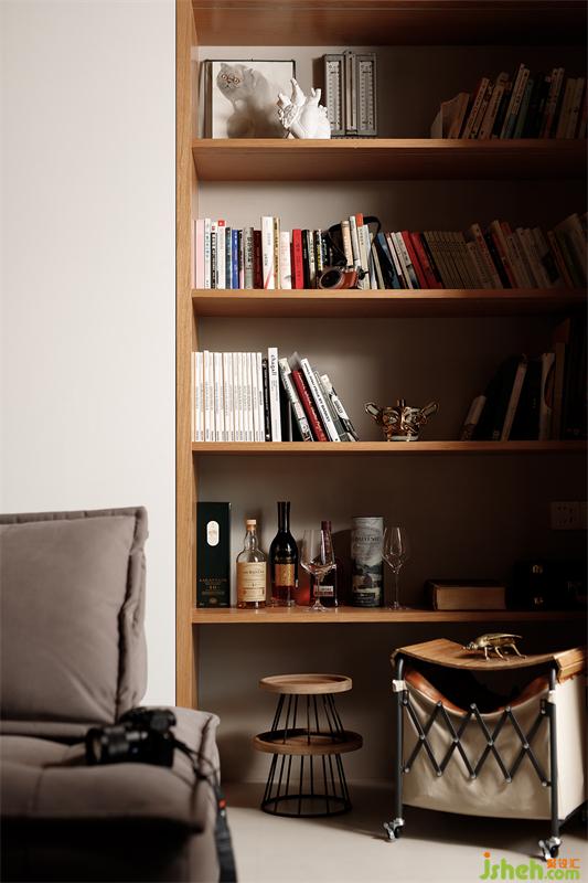 沙發(fā)背后的書柜墻用于展示和收納。盛滿陽光與溫暖的地臺溢出陽光于書本之上。配上最愛的紅酒,身邊蜷縮著軟綿綿毛茸茸的貓咪,孩子在陽光下搭著積木……空間向外延展帶來的釋懷感和被溫暖擁抱的溫馨放松都在當下被實現(xiàn)。