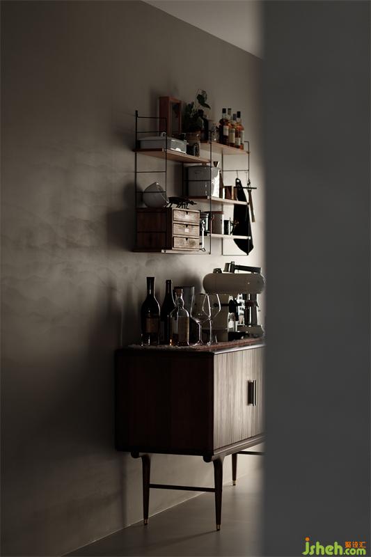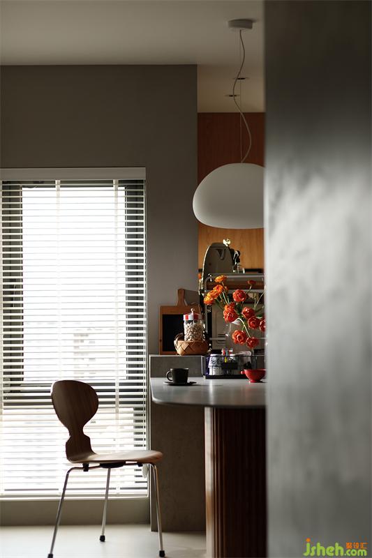 ② 餐廳與廚房空間打通,形成開放式的一體化餐廚區(qū),并在餐邊柜處實現(xiàn)了屋主最常用的咖啡制作區(qū)。
