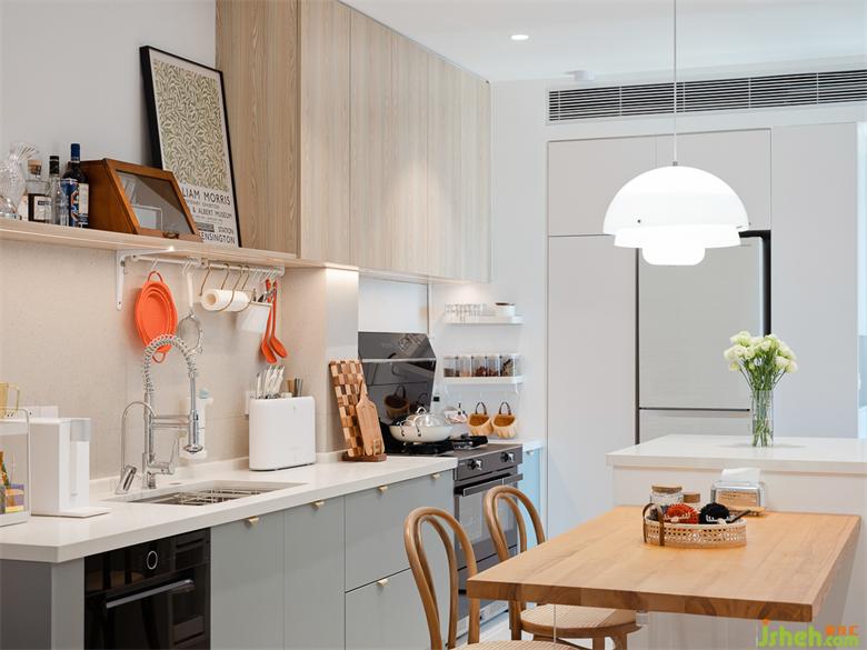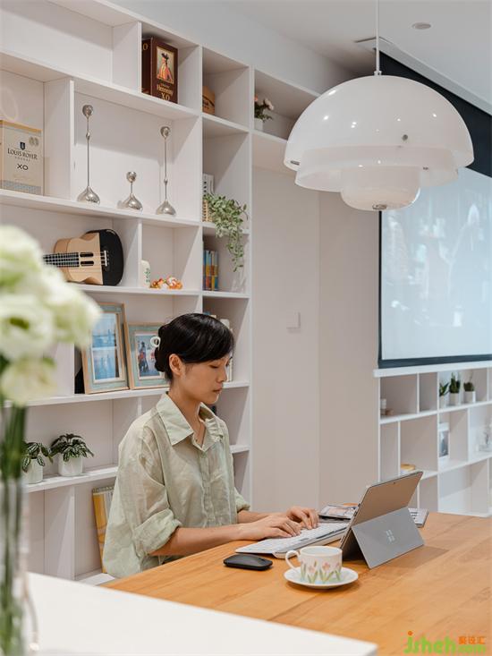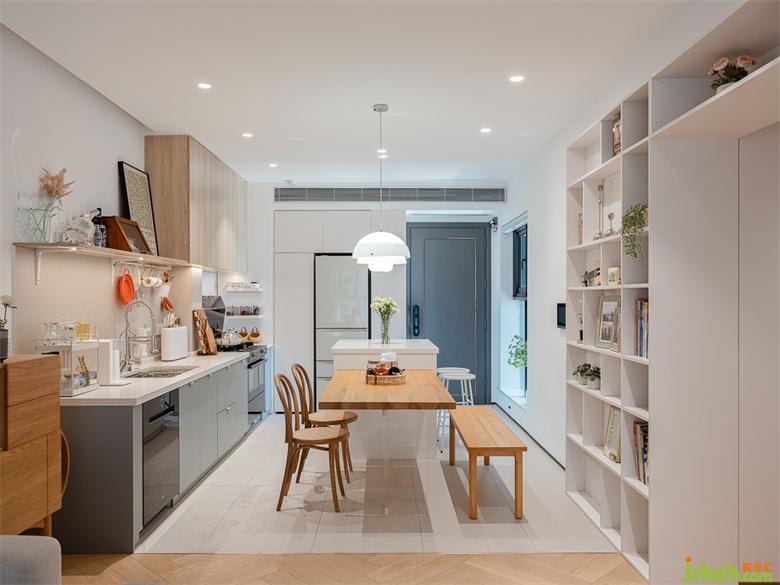 開放式的廚房好處是解放了原本局促的小空間,沒有了隔墻,動線也流暢起來。家裝設(shè)計一張定制大餐桌滿足了男女主日常的輕辦公,“懸空”的桌面,在視覺上變得輕量化,后方是客廳延伸過來的開放書墻,讓物品的拿取更加方便。