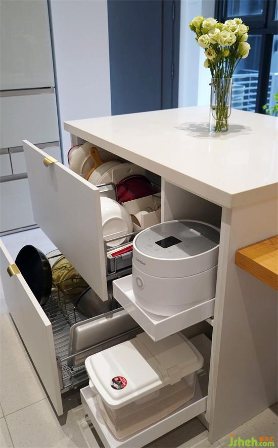 足夠的操作臺(tái)面釋放出更多的功能,廚房同時(shí)兼具水吧、餐邊柜的作用。家裝設(shè)計(jì)島臺(tái)下方超大容量的碗柜足夠容納家中大部分鍋碗灶具,還有男主自己diy的滑軌式抽屜,讓小家電也可以輕松收納取用。