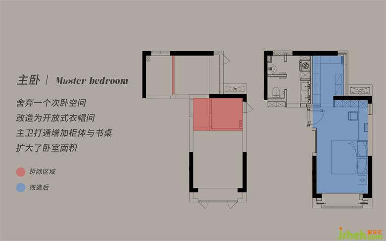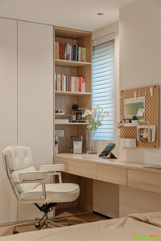 將原本的主衛(wèi)空間打通后,主臥擴(kuò)容到了15.8㎡,并順勢定制了一面書桌和柜體作為收納補(bǔ)充,整合后的臥室溫暖舒適,家裝設(shè)計(jì)營造出柔和溫潤的氛圍。
