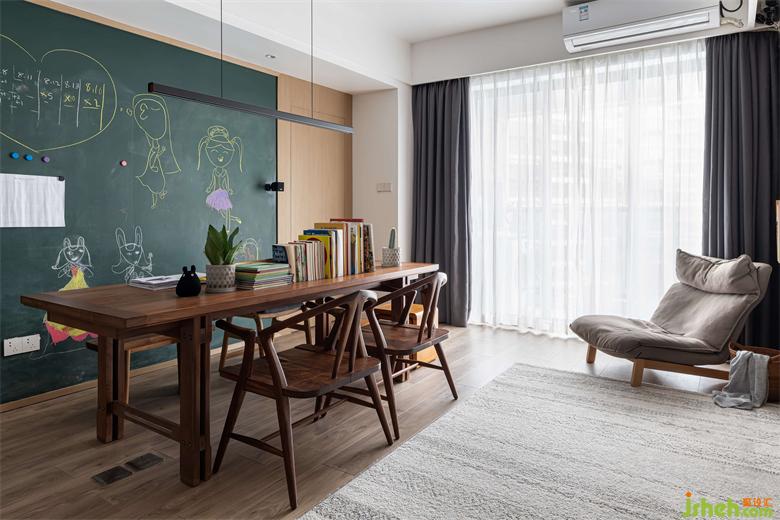 客廳的木長桌是屋主從上一套房子遺留下來繼續(xù)使用的,兼顧了用餐、閱讀、游戲等功能于一體,柔軟親膚的乳白色地毯是姐妹倆最愛的自由天地,在這里,家長也可以是小孩子,實現(xiàn)一起躺臥閱讀,休閑娛樂的天倫之樂。黑板墻隨時隨地讓孩子展開藝術的想象。