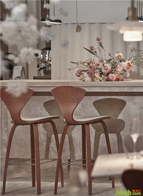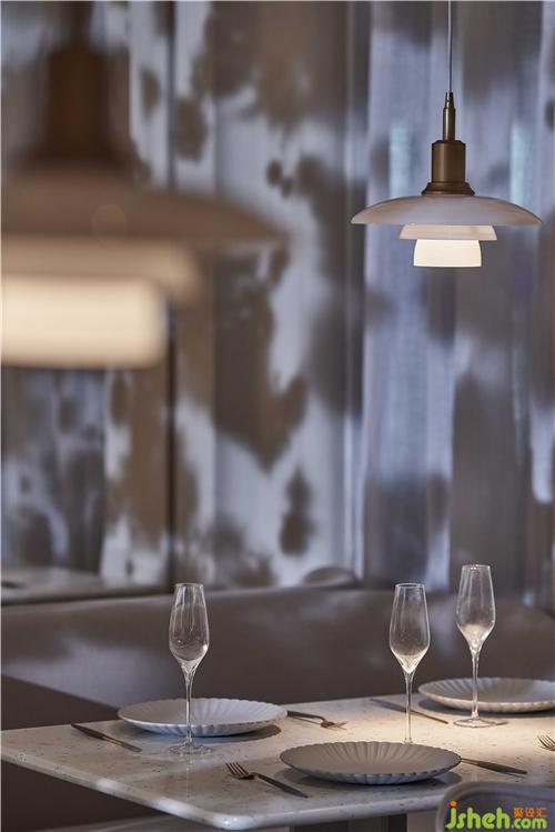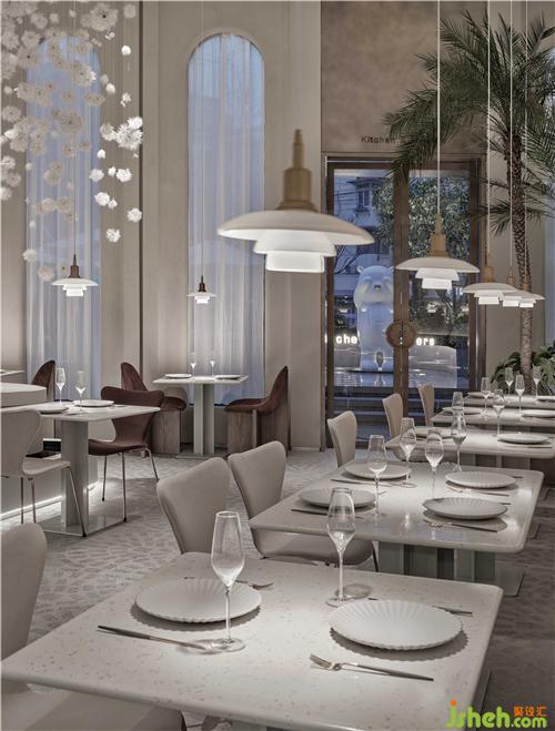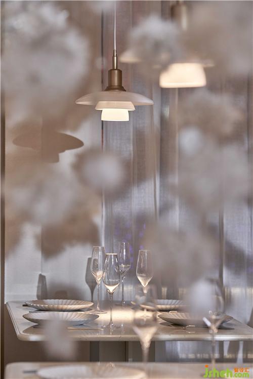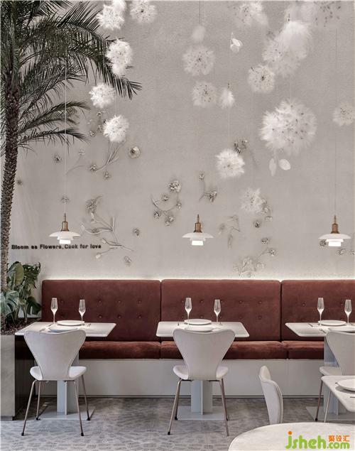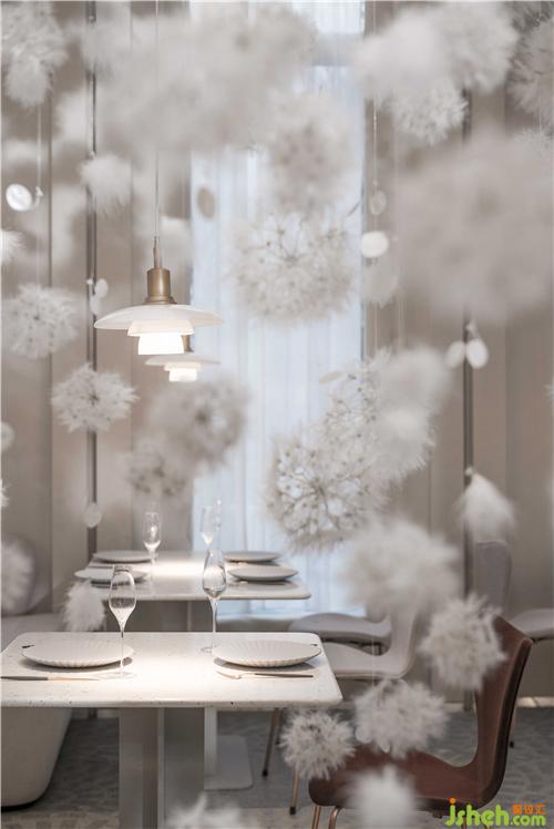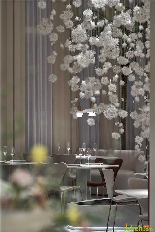 空間的物體線索來自蒲公英,我們設(shè)想蒲公英隨風(fēng)飄向大自然的和諧性,來自于生物和環(huán)境的有機互動,種子從母體脫離,散開飄動時產(chǎn)生的一種自然優(yōu)美感;于是設(shè)計師提取了蒲公英的概念去詮釋花廚的意義,上海餐廳設(shè)計把蒲公英的形態(tài)重新抽離組合,形成一種新的裝置藝術(shù)表現(xiàn)與空間對話,又相互彼此的消化著蒲公英的形態(tài);把藝術(shù)裝置作為主體,客戶作為飄散的另一個載體,嘗試將美好和美食傳播到外界。