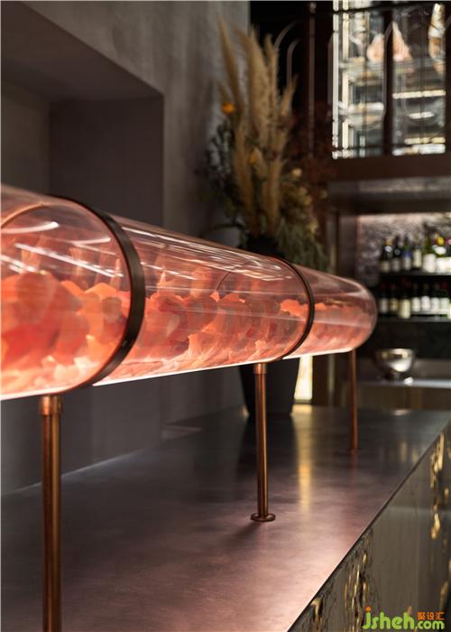 餐廳呈現(xiàn)出都市輕奢與工業(yè)復古的風格調(diào)性,空間中大量使用古銅及黑胡桃木,搭配泛光化的照明,給人溫暖自然的感覺上海餐廳設(shè)計。餐廳擁有采用喜馬拉雅巖鹽制成的干式熟成室、開放的食材儲存區(qū),可以讓客人能直觀地欣賞和挑選食材。