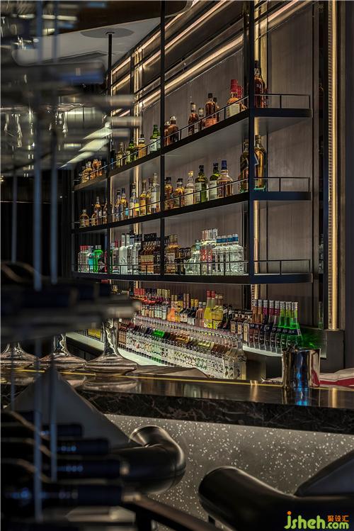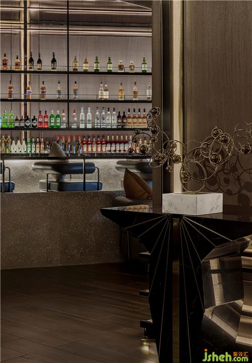 和前臺接待區(qū)域不同,運用深色大理石、些微金屬點綴,輔以柔和色彩燈光的吧臺區(qū),順享精致質(zhì)感。