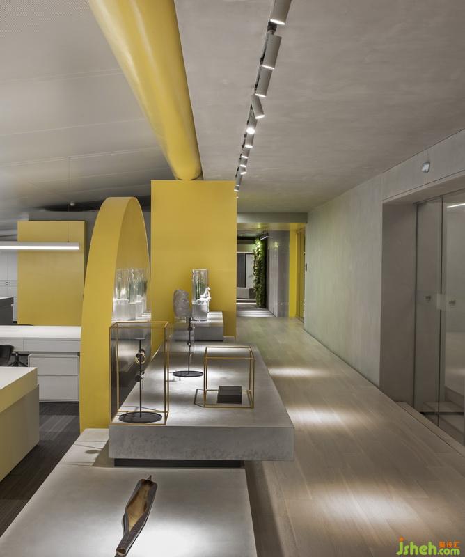 延續(xù)費(fèi)羅娜的企業(yè)和產(chǎn)品風(fēng)格,用代表“砼”的力量灰為主色調(diào),統(tǒng)一應(yīng)用在天、地、墻面,圓、方、三角形態(tài)的溫柔黃色穿行在“力量”灰調(diào)中,通過曖黃色的燈光渲染,力量與溫情的高度溶合,便是設(shè)計師對費(fèi)羅娜的設(shè)計靈魂所在,也正是簡約風(fēng)格的所在。
