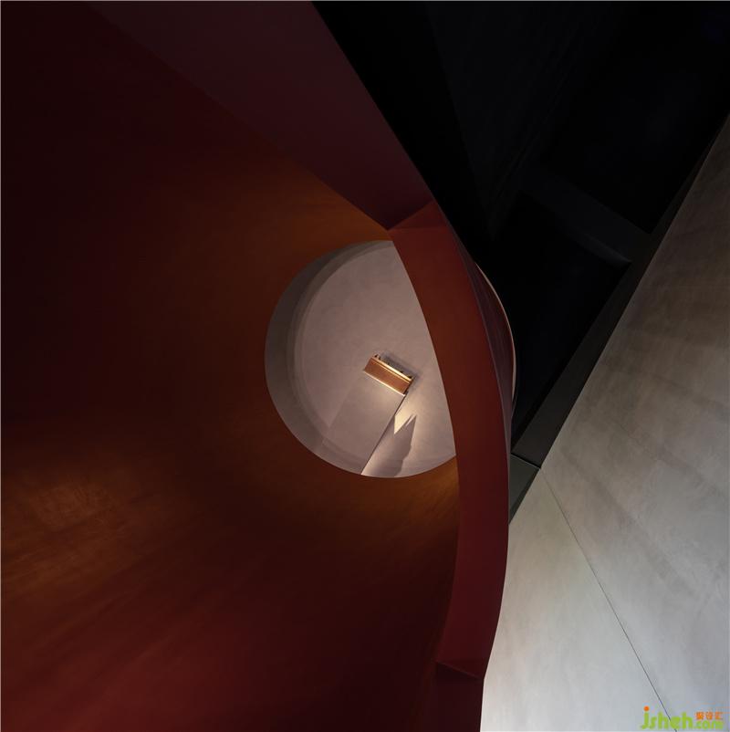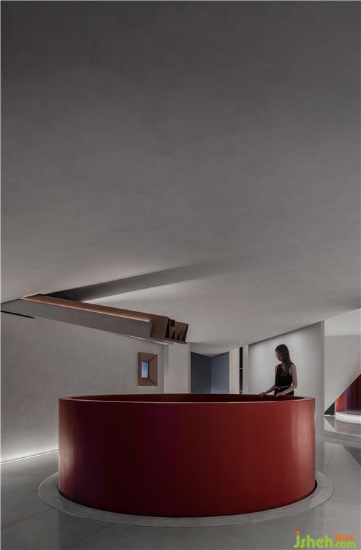 梯、方、圓,形態(tài)各異的體塊,錯(cuò)落疊合。入口設(shè)計(jì)在隱于方形體塊一側(cè),佛山辦公室設(shè)計(jì)無(wú)任何裝飾的水泥灰白,有種猜不透的冷靜感,脫俗而低調(diào)的門面躍然而現(xiàn)。
