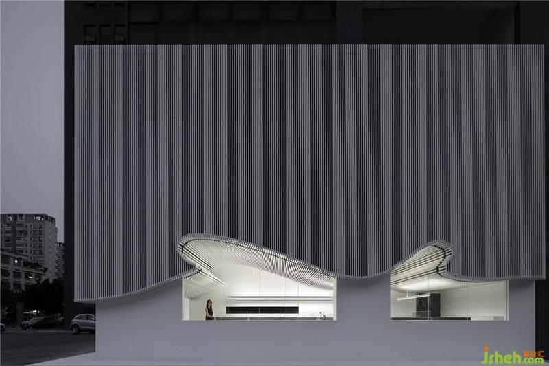 白色的鋁通管從建筑外立面的頂端拉至一層的天花,筆直的線(xiàn)條猶如織布機(jī)上一排排整齊細(xì)密的紗線(xiàn),包裹著建筑。
