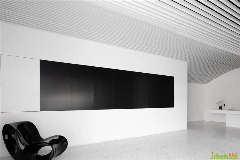 鋁通從二層建筑頂部平直的起點(diǎn)拉至一層后,調(diào)節(jié)不同的收尾長(zhǎng)度在同一平面形成曲線(xiàn),并與室內(nèi)的曲度一致,給人以建筑外墻的鋁通從建筑頂部一直貫穿至一層天花的即視感。