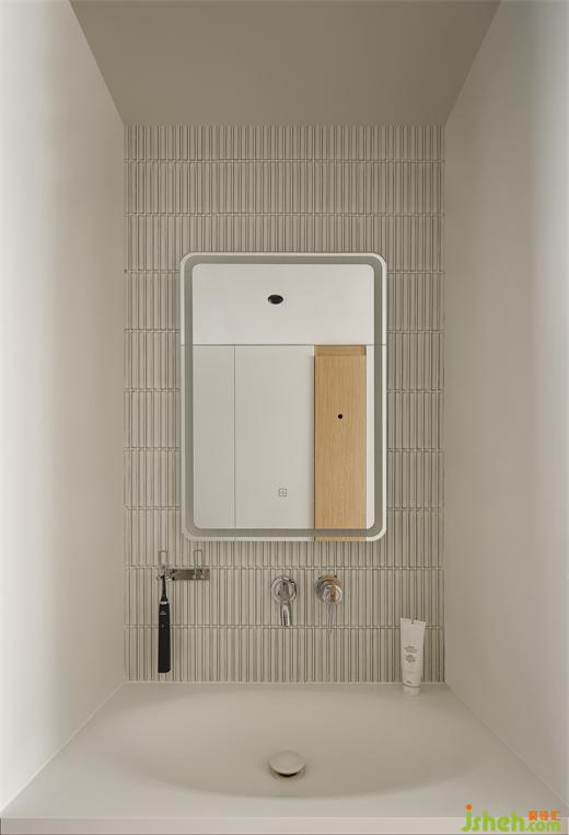 和走廊融為一體的洗漱區(qū),條形馬賽克瓷磚細(xì)節(jié)滿滿,裝修公司用可耐力材料一體成型定制的洗手池,美觀的同時(shí)又沒有衛(wèi)生死角。