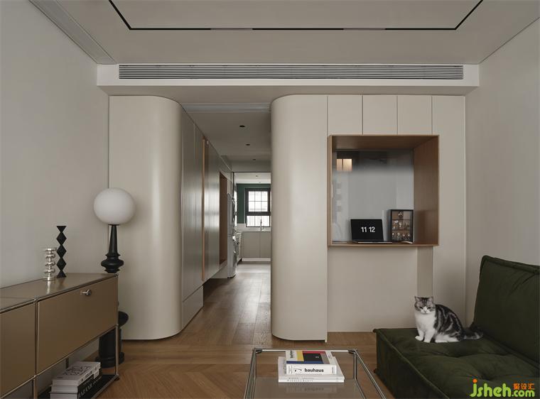 設(shè)計(jì)師通過把衛(wèi)生間墻體內(nèi)移,拓寬了過道寬度,原本狹窄的地方,裝修公司擁有了更好的通風(fēng)和采光條件,是盤活一字戶型的關(guān)鍵一步。