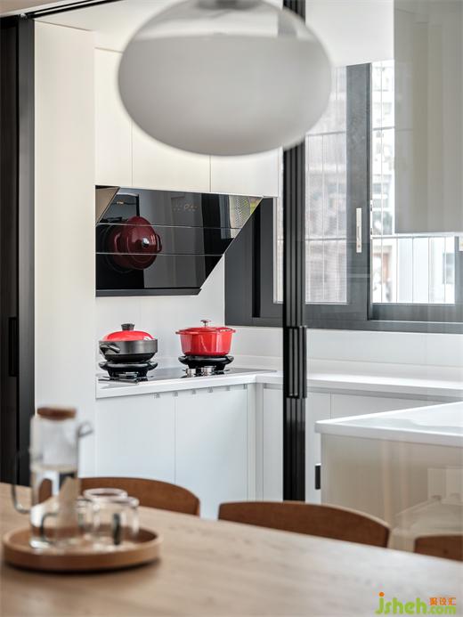 美食成為家人間最深的牽絆,匯聚著家與人之間,絲絲不斷的情誼,裝修公司餐廳與廚房由一道玻璃推拉門隔開,無論開合,視野與光線都不受影響。