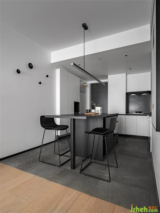 一字型的中島臺提供了更大的操作和儲物空間,同時形成玄關(guān)和餐廚的洄游動線,家裝設(shè)計擴大了整個空間的視野,也增加了實用性,嵌入式的家電沒有多余的累贅,顯得餐廚區(qū)更加簡潔統(tǒng)一。