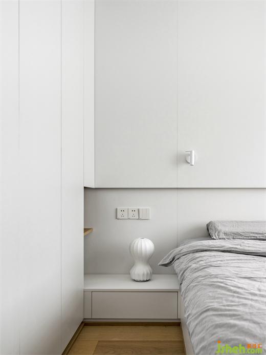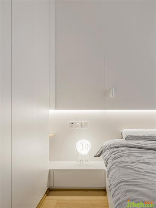 室延續(xù)了空間的整體配色,并且將其做到了極致,映入眼簾的都是干凈與純潔,家裝設(shè)計白色的衣柜與護墻板形成連接,置入燈帶,再配上精致小巧的床頭燈,可以實現(xiàn)不同的燈光氛圍,感官上的簡約也落實在細節(jié)之處。