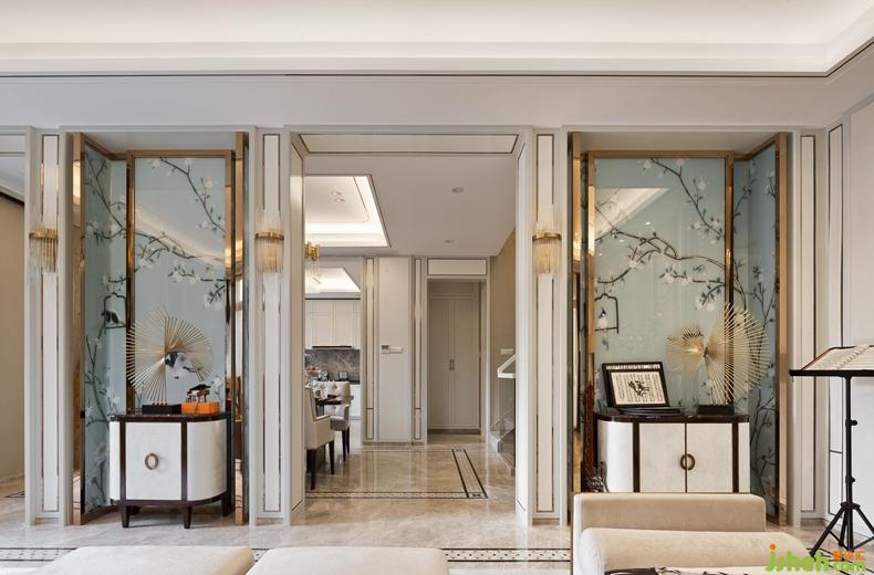主要材料08下疊:香檳色亮光漆,羅馬天使大理石,云灰石大理石,帕斯高灰大理石,藝術(shù)玻璃,花鳥墻紙,皮雕