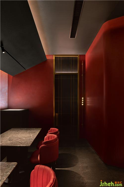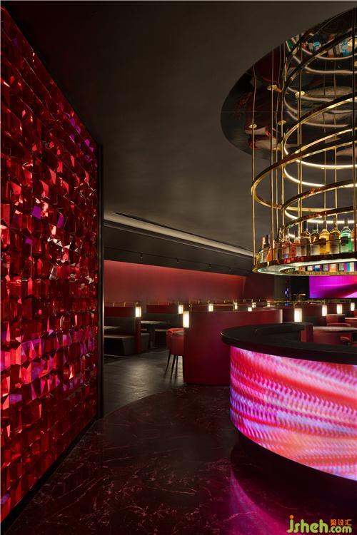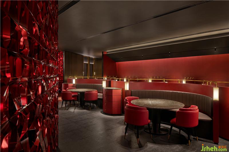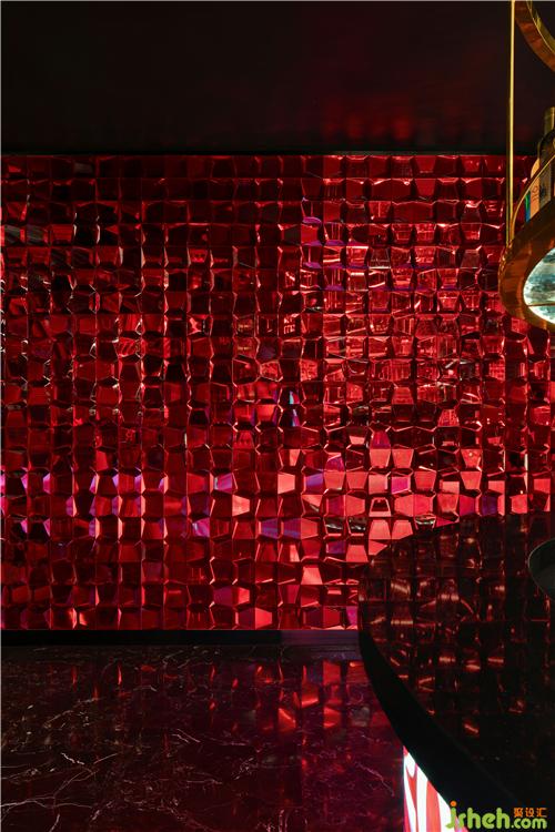 初步入餐廳,環(huán)抱式前臺為客戶展開熱情的問候呈現(xiàn)儀式感,曲折蜿蜒帶領(lǐng)人開啟探索之旅,水晶玻璃磚以重復(fù)、組合的秩序布滿墻面,在紅色的燈光渲染下神秘且魅惑,引人遐想。