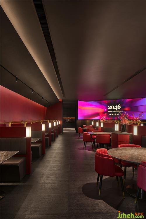 具有視覺張力的充滿未來感的空間,弱化了黑色帶來的壓抑感。諾大的LED屏將動感與科技感結(jié)合餐廳設(shè)計,制造放松的、沉浸式用餐氛圍,紅色與光影的強烈對比形成虛擬未來感,帶來極度的視覺震撼。