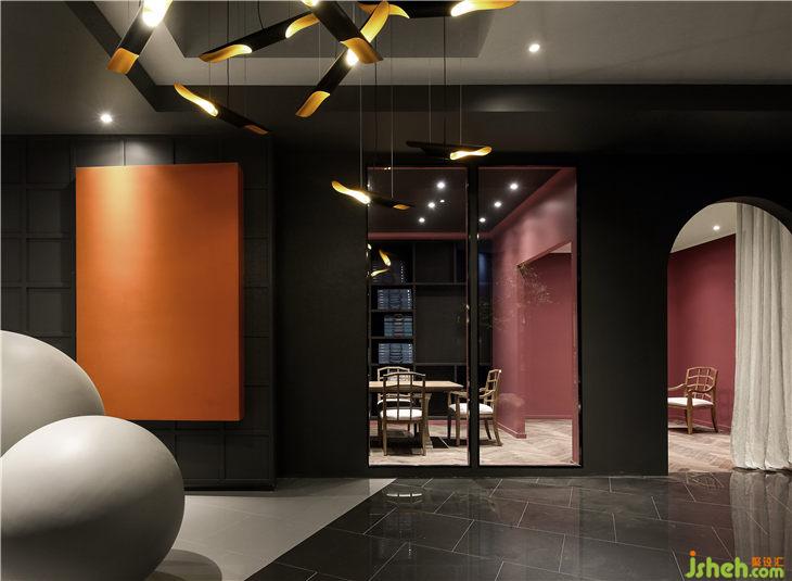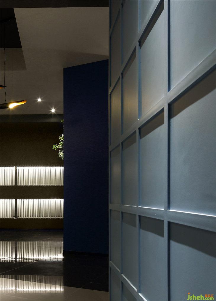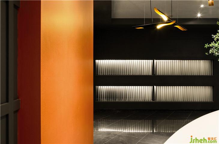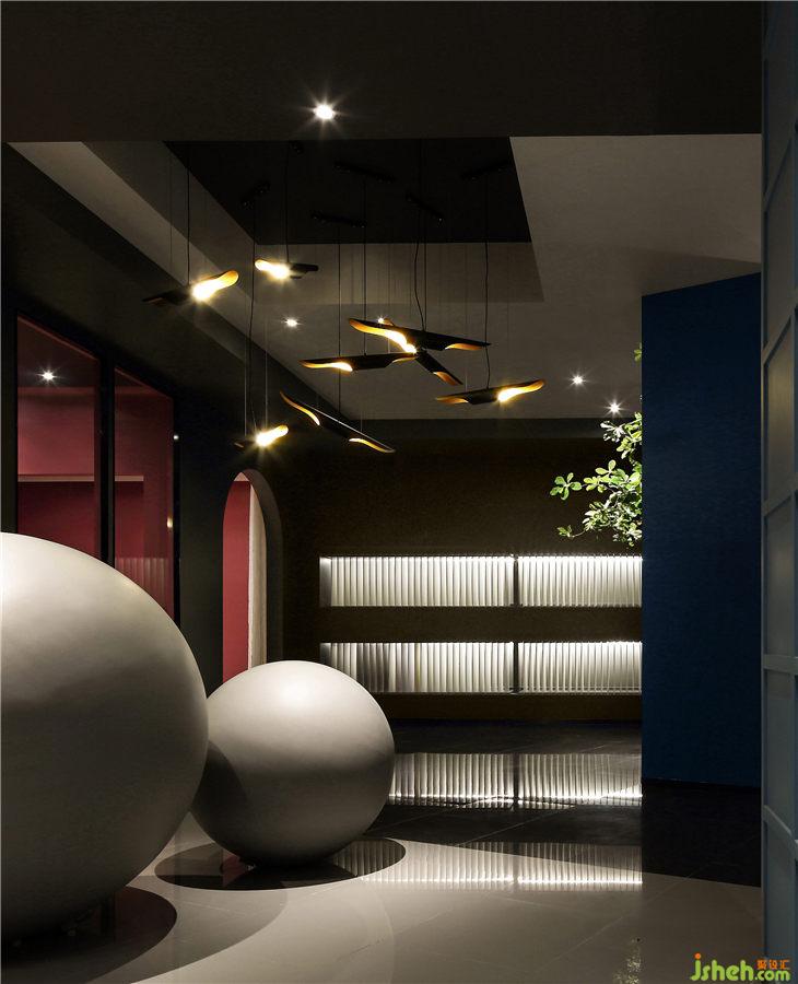 多形式的混合照明有利于形成良好的室內(nèi)環(huán)境,面光與墻面光互相配合,無論是規(guī)律的牛眼燈,還是從井格射出的光線,抑或后現(xiàn)代雙管鋁筒斜管燈,設計性和存在感都是其特色,或靜或動或明或暗,圍合出一種光羽琤琮,朗月澄明的空間意境。
