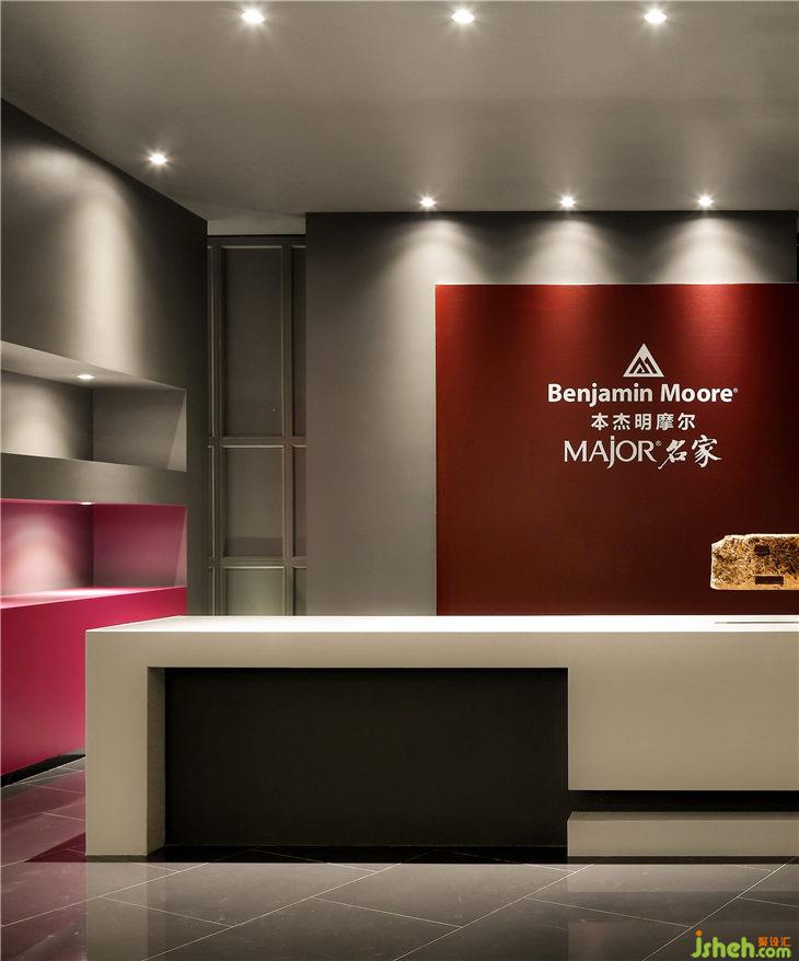 因而項目整體的設計并沒有加入太多商業(yè)化的行為,本杰明摩爾的行業(yè)地位也決定了它根本無需那樣過度的包裝。在這樣一個200平的場地里,除了必要的展示區(qū),設計師留出了足夠的空間用以會見、洽談、休憩和行走。平面結(jié)構上,考慮到各區(qū)域的獨立性、關聯(lián)性與實用性,選擇利用墻體來作為展示產(chǎn)品實際涂裝效果的載體,一方面明確了本杰明摩爾涂料的獨特肌理和色彩厚度,另一方面也賦予空間清晰的體塊關系。