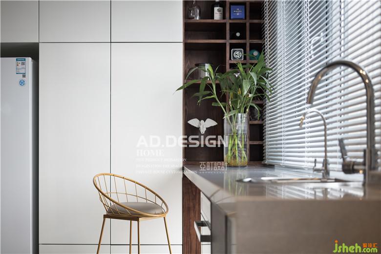 本案的主調(diào)沿襲了當(dāng)下年輕人獨愛的高級灰,白色為主導(dǎo),穿插黑灰。家具配飾上選用金色、黃色做點綴,讓優(yōu)雅的空間增添了熱情。全房地面除廚房、衛(wèi)生間以外均采用實木地板,低調(diào)且溫暖的質(zhì)感平衡了冷淡的灰白色和黑直線。