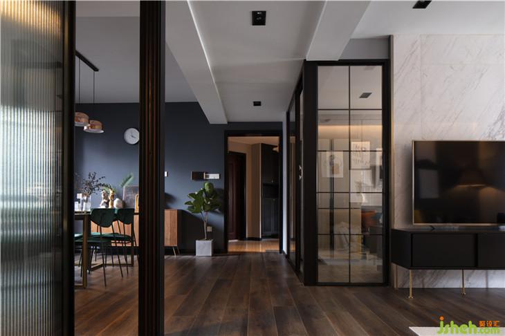 客廳的黑灰色皮質沙發(fā)結合墨綠色的斯家蒙的單椅,與景觀陽臺的黑色馬賽克以及墨綠色窗簾相呼應,而電視背景墻則是由兩側透明的鐵藝玻璃隔斷與中間整面爵士白大理石構成,玻璃隔斷使客廳與廚房間隔開來,滿足了廚房因窗戶小采光不夠而增加了的兩側采光,而大理石則遮擋了背面廚房的西餐操作臺,增加了廚房的操作臺面的需求,又讓客廳因這面電視背景墻而更加生動。