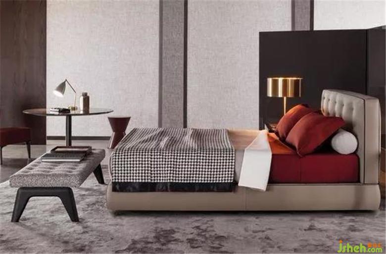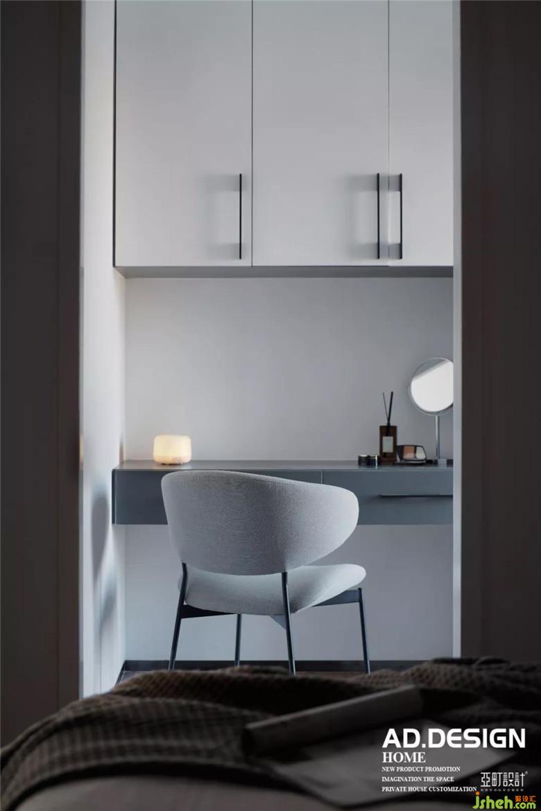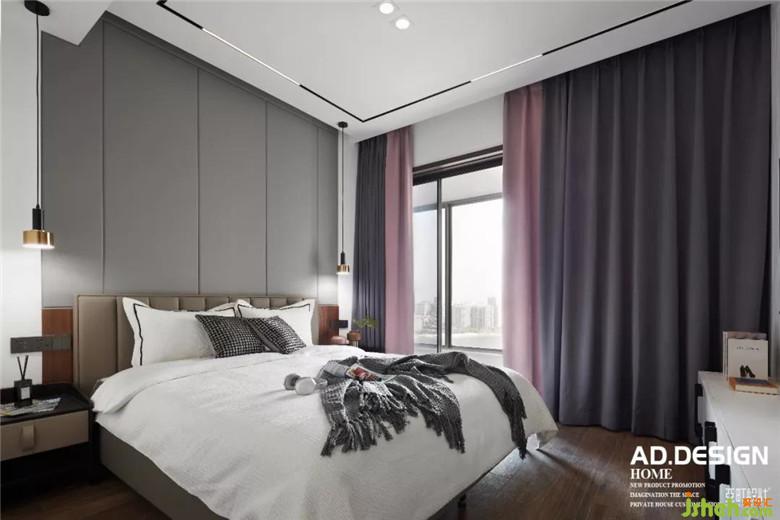 主臥空間裝修公司在床頭背景用部分的木飾面與客廳餐廳公共區(qū)域相呼應,硬包墻布的設計增加床頭的舒適度,豎向的分隔與電視墻面造型相平衡,在墻布的素雅的映襯下,頂面無主燈的現(xiàn)代照明設計讓空間更具高級感。