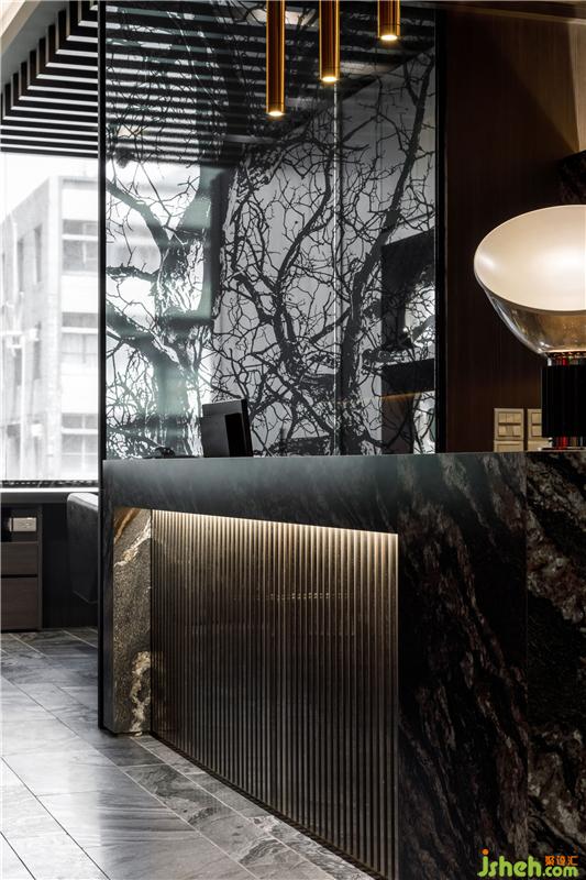 石材、金屬、木質(zhì)格柵、圖騰,在四種元素交織的語匯下,藉由光影把之間特色更顯得展露無疑,圖騰像是存在于虛與實的錯綜里,與外面的動態(tài)讓人產(chǎn)生錯覺。金屬折射的鋒芒,蔓延在石材當(dāng)中,他們的言語纏綿著木紋,逐漸串連整個場域,更貫穿于空間最深處,訴說彼此的精神訴求,透過光影交錯與材質(zhì)間的本質(zhì),打破顏色間最沉默的原色。