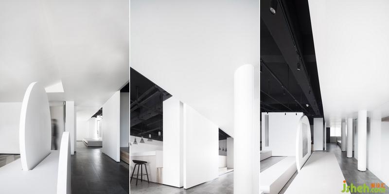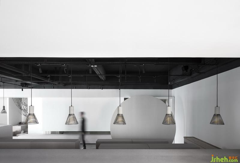 羅丹說,“塑造的時候,千萬不要在平面上,而是要在起伏上思考。”在250平米的展示空間內(nèi),楊氏以雕塑的筆法來塑造。射線、圓柱、方體構(gòu)成了立體的錯層空間,讓工作區(qū)、辦公區(qū)、展覽區(qū)、多功能區(qū)既各自獨立又互為補充。多功能區(qū)以梯級的形式呈現(xiàn),活化了展覽空間的功能屬性。它既可以是大講堂,也可以是以產(chǎn)品的藝術(shù)創(chuàng)作過程為主體的視覺展或是與生活美學(xué)相關(guān)的美物展覽……如此,展覽陳設(shè)區(qū)變得愈加多元,實現(xiàn)了碩瀚創(chuàng)研希望創(chuàng)造不一樣的展覽體驗效果的初衷,讓空間設(shè)計始終回歸到展覽空間的本質(zhì),達到最大化的共享,激發(fā)出富有彈性的全新展覽型態(tài)。
