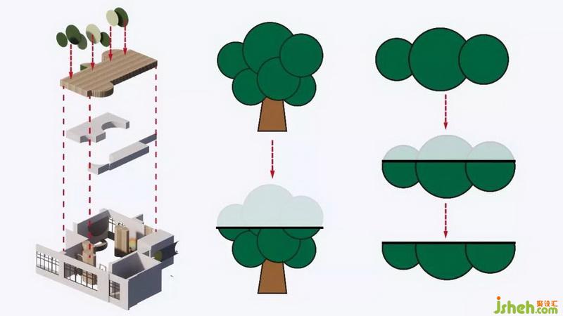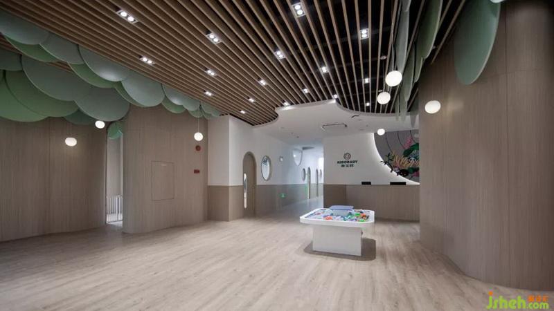 圓的元素在空間中的表達(dá),比其他的圖形都更加有意義。學(xué)者伊麗莎白·闊特對(duì)肯尼亞兒童和成人的研究,因格瑞德和斯文安德森對(duì)納米比亞黑巴部落成員的研究,都證實(shí)了這個(gè)觀點(diǎn)。兒童涂鴉期出現(xiàn)的圓形,往往被賦予了“人”的意義。孩子“最初畫(huà)出的真正表征性的形狀就是圓形和橢圓形”。“因?yàn)閳A形的簡(jiǎn)潔和完美,人的視知覺(jué)就會(huì)把它挑選出來(lái),對(duì)它產(chǎn)生偏好”。設(shè)計(jì)師把大樹(shù)的元素抽象簡(jiǎn)化后,提取圓形幾何圖形,為營(yíng)造參天大樹(shù)的視覺(jué)感受,特意把圓形截取部分融入在天花里面,以小孩的視覺(jué)感受出發(fā),只看到大樹(shù)的下半部分,形成猶如幾棵參天大樹(shù)聳立云霄的視覺(jué)感受。