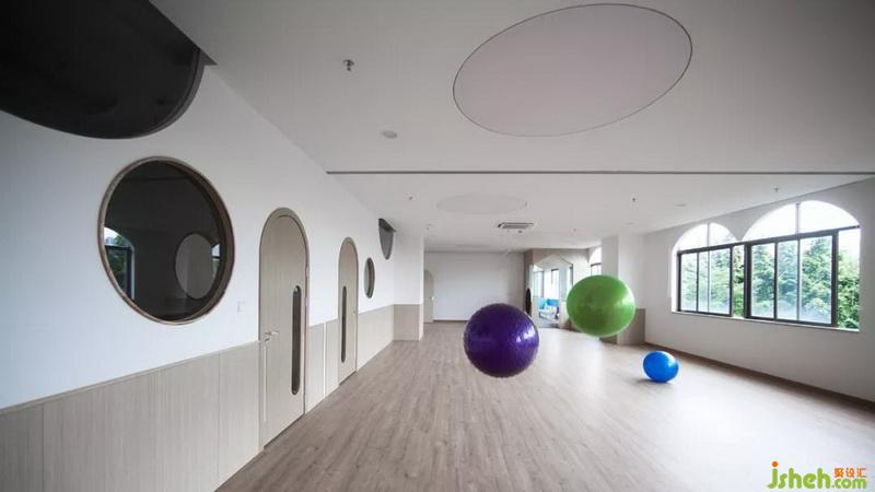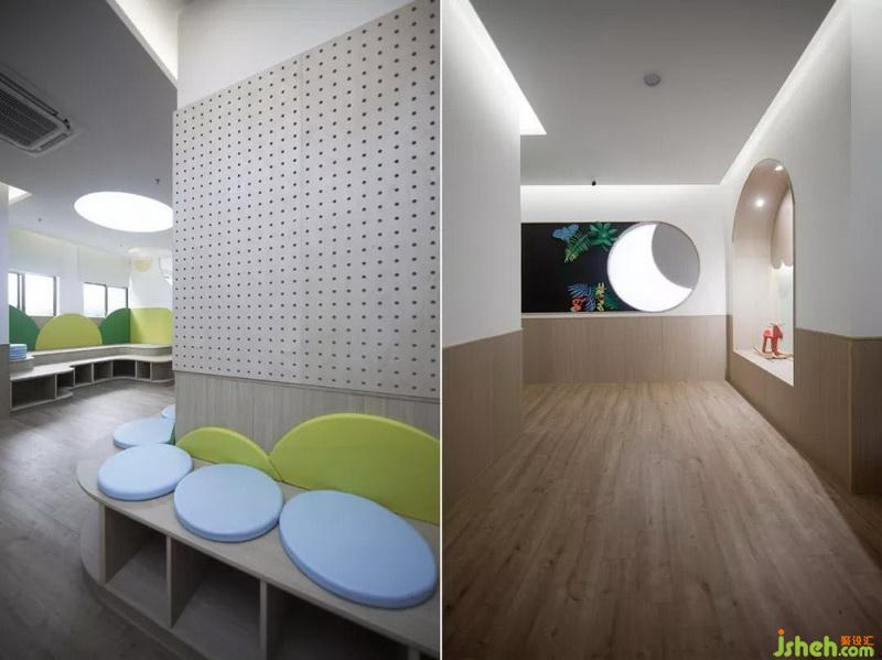 在其他空間的設(shè)計(jì)上同樣延續(xù)圓形的形狀去探索與孩子們的交流,希望能夠讓孩子們更快地去融入到這個(gè)空間里面;營(yíng)造出像孩子們自己的家同樣的親切愉悅感受。在課室的墻上把教學(xué)黑板通過(guò)簡(jiǎn)煉的幾何圖形設(shè)計(jì),拉近空間環(huán)境與孩子們的心理距離。