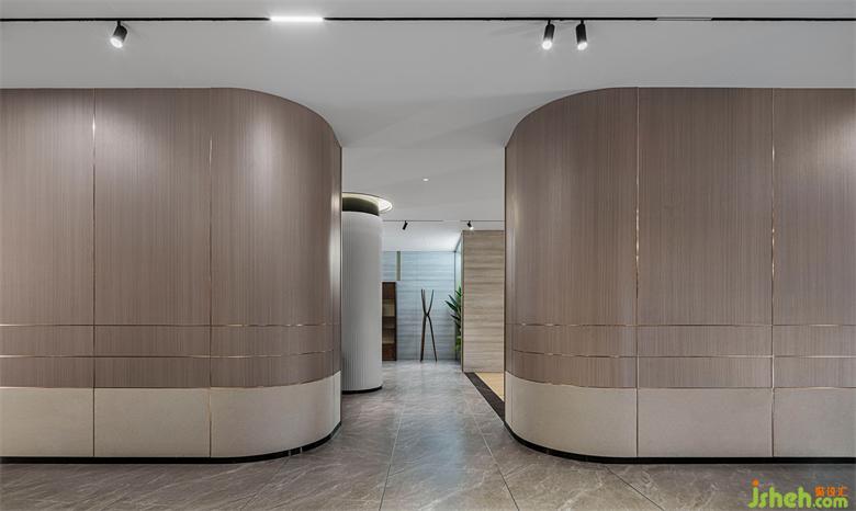 當(dāng)空間被劃分為不同功能空間時,需要用一個支點(diǎn)將空間各區(qū)凝聚起來。每個區(qū)域都有弧形造型來連貫,既貫穿各展示區(qū)域引導(dǎo)視覺動線,也以概念化手法呈現(xiàn)項目的核心理念。