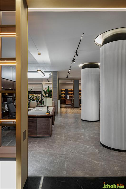 展示區(qū)的產(chǎn)品分布在每個造型區(qū)域,區(qū)域中沒有過多的配飾,用空間放大產(chǎn)品的感受力。家具展廳設(shè)計在展廳的末端,為企業(yè)自用的辦公室及休閑娛樂空間,開放式的辦公設(shè)計,讓來賓更能感受自由辦公概念。