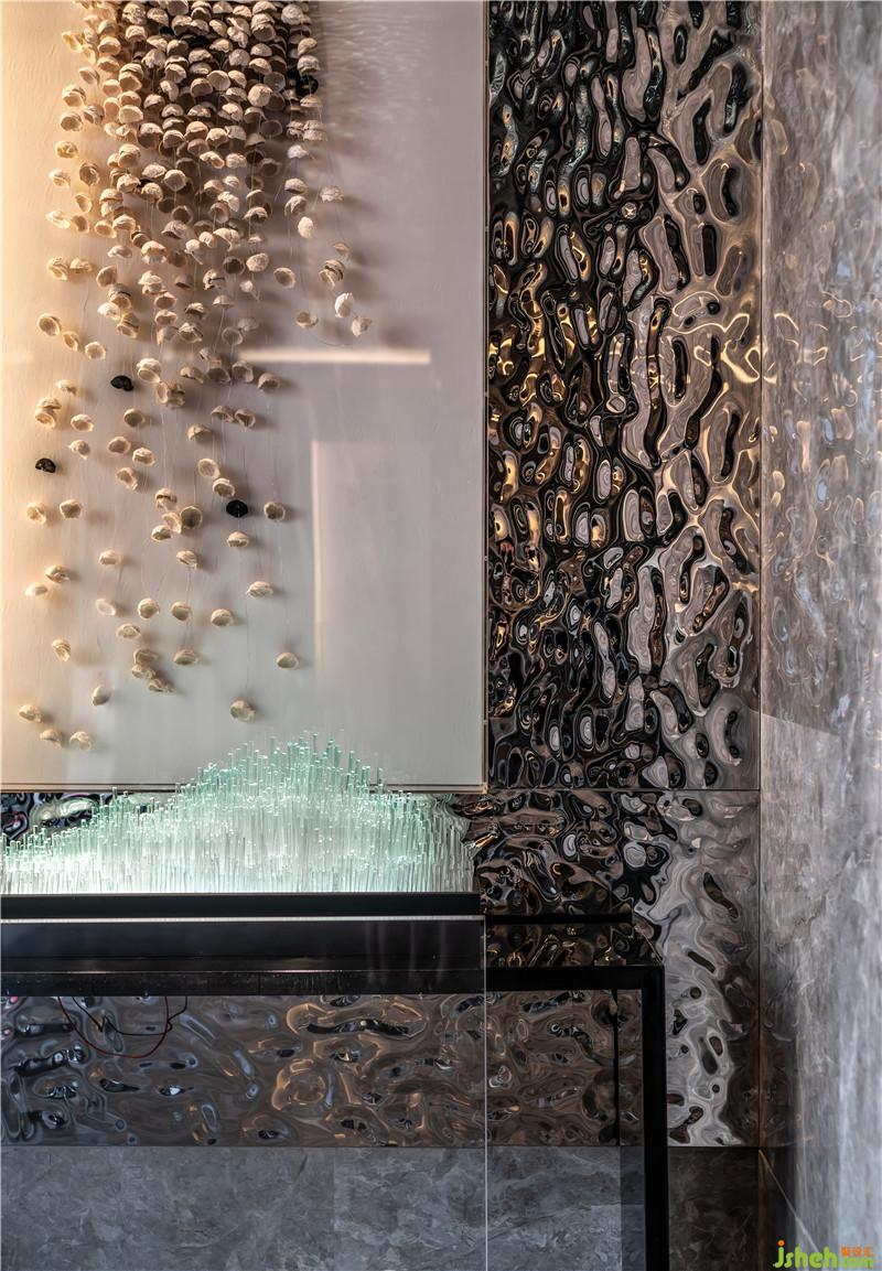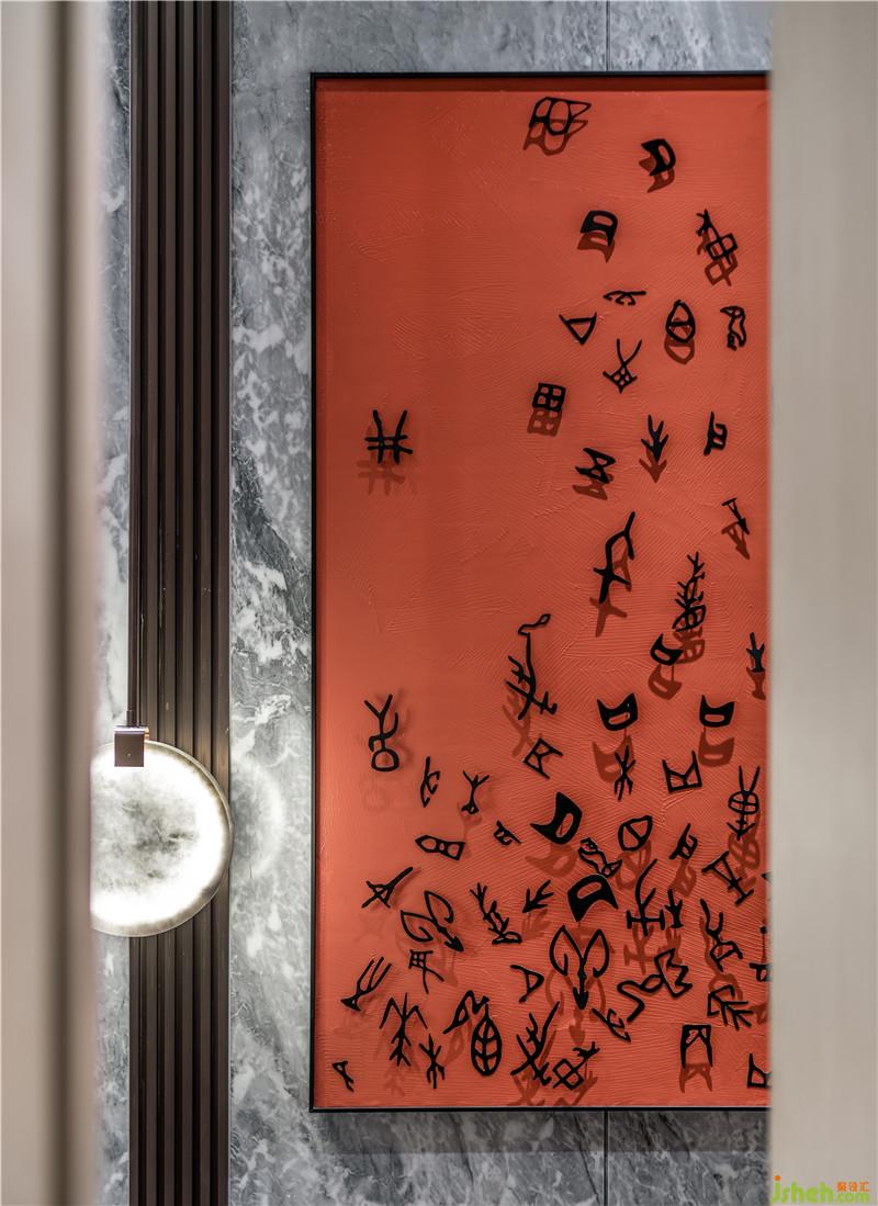室內(nèi)空間圍繞兩條線展開,其一為“禮”,以傳統(tǒng)的禮序作為漸進(jìn)空間的打造,層層禮序、步步進(jìn)階,演繹“五進(jìn)”歸家之禮。其二為“趣”,由數(shù)量眾多的小缽狀組成的藝術(shù)畫作《漣》,賦有盆豐缽滿,豐收與財富匯聚于此。裝修公司