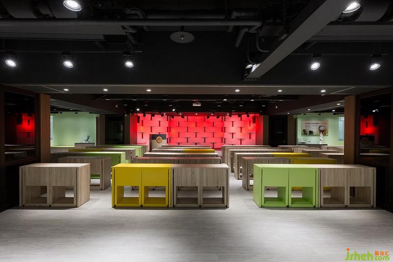 在風(fēng)格營造上,以鐵件框設(shè)利落的線條,柜臺(tái)天花板以流線木作拉伸視覺效果,鑿面石皮則注入獨(dú)特的粗獷感受,展演廳內(nèi)部繽紛的訂制桌椅與外露管線形成明暗對比,講臺(tái)壁面采用宛如編織方格狀的純白量體,搭配色調(diào)豐富的燈光設(shè)計(jì),聚焦觀者視覺。